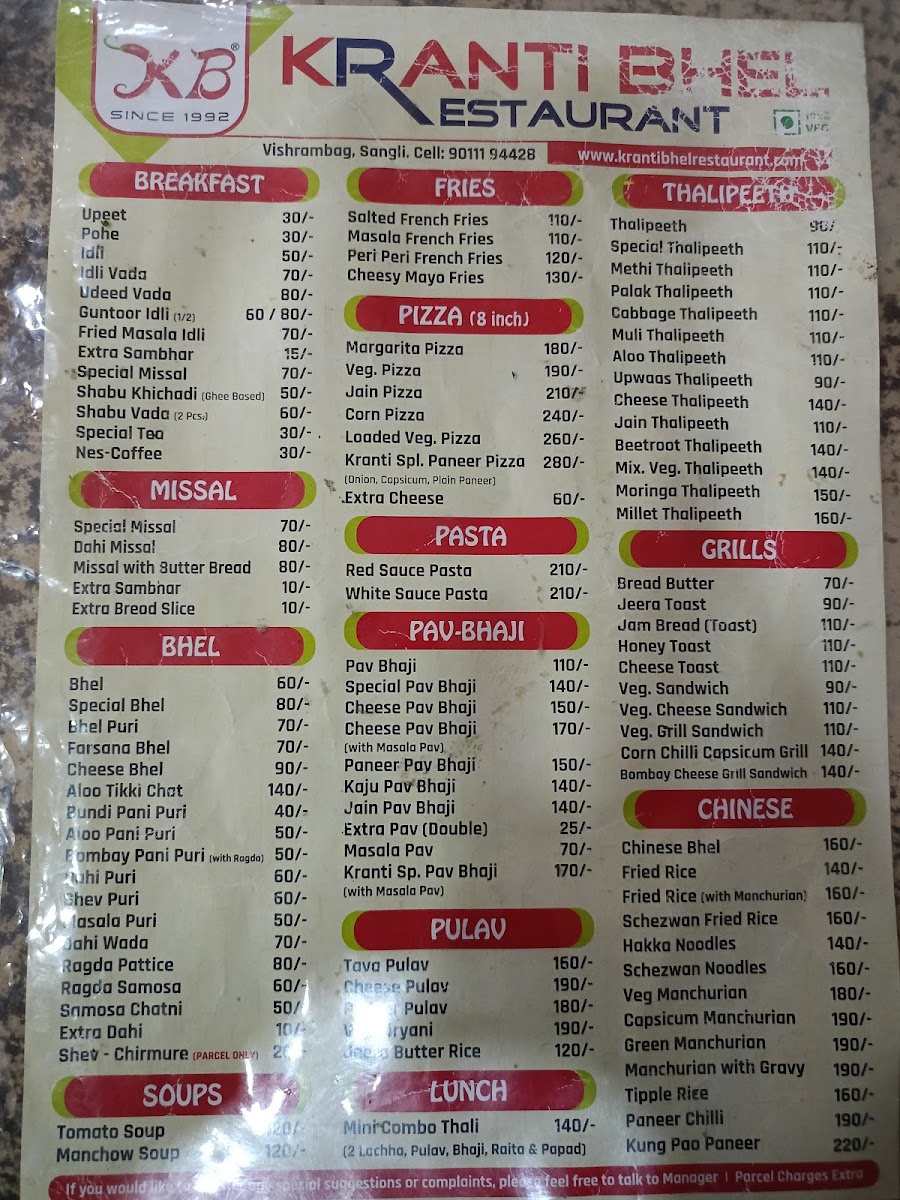 In conclusion, whether you are in Sangli for a visit or a local resident, make sure to stop by Kranti Bhel Restaurant. With its extensive menu, efficient service, and the delightful flavors of street food, it promises a satisfying dining experience that will keep you coming back for more.